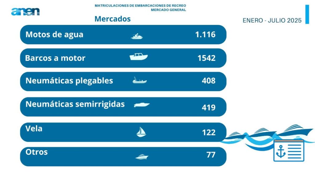 Entre enero y julio de este año se han matriculado en España 3.684 embarcaciones de recreo, lo que supone una caída del -2,5% respecto al mismo periodo de 2024, según el Informe del Mercado de Embarcaciones de Recreo (enero-julio 2025) elaborado por ANEN a partir de los registros de la Dirección General de la Marina Mercante.